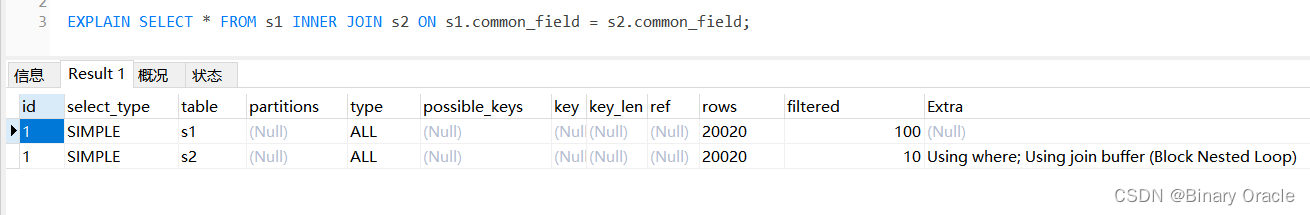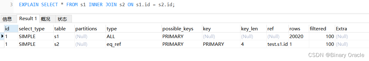 从执行计划的结果中可以看出,MySQL打算将s1作为驱动表,s2作为被驱动表,重点关注s2的访问方法是eq_ref,表明在访问s2表的时候可以通过主键的等值匹配来进行访问。