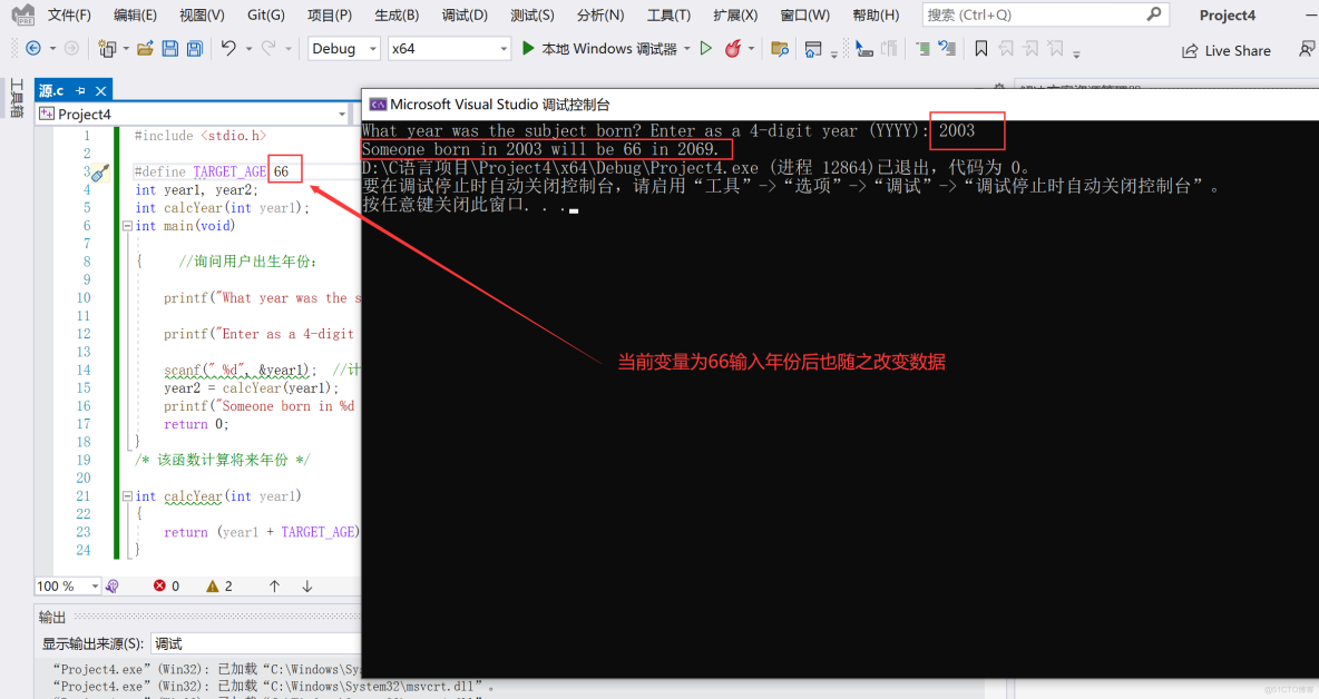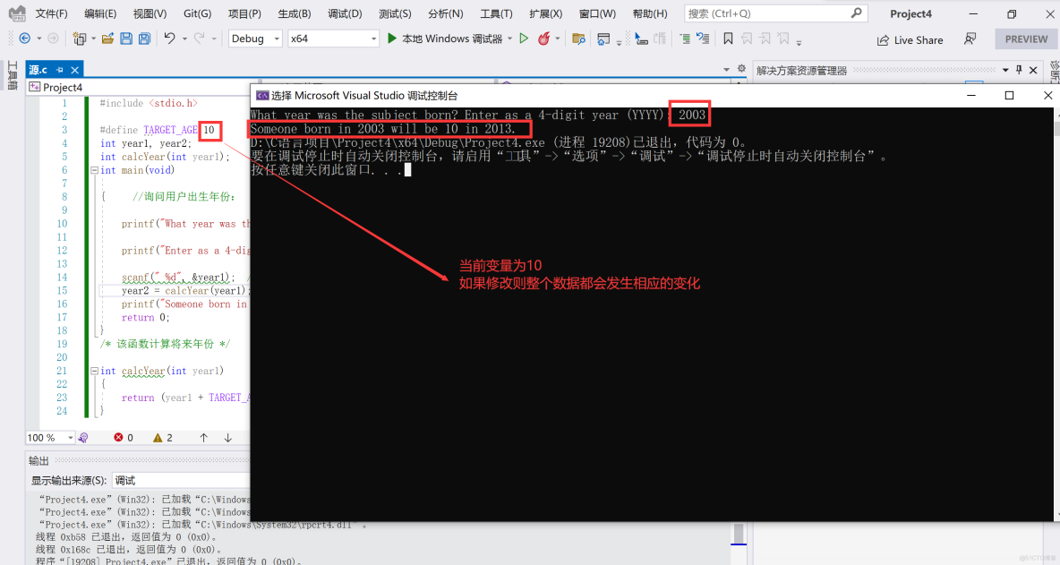其中,第23行的return语句属于calcYear()函数,该函数计算一个人到指定年龄时的年份,通过将#define定义的TARGET_ AGE加上变量year1,并将结果返回调用calcYear()的程序。第17行的return语句,在程序结束前将0这个值返回操作系统。