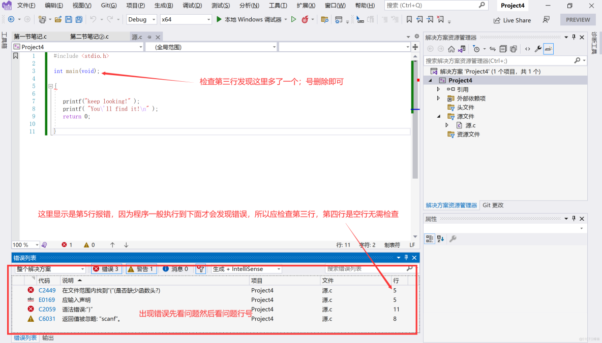 出现这种情况的原因是C语言会忽略行与行直接的间隔,虽然 ; 属于printf()语句但是也可置于下一行,所以编译器执行到第6行的return语句后才确定遗漏了分号因此编译器报告第6行出错。