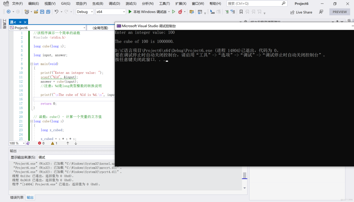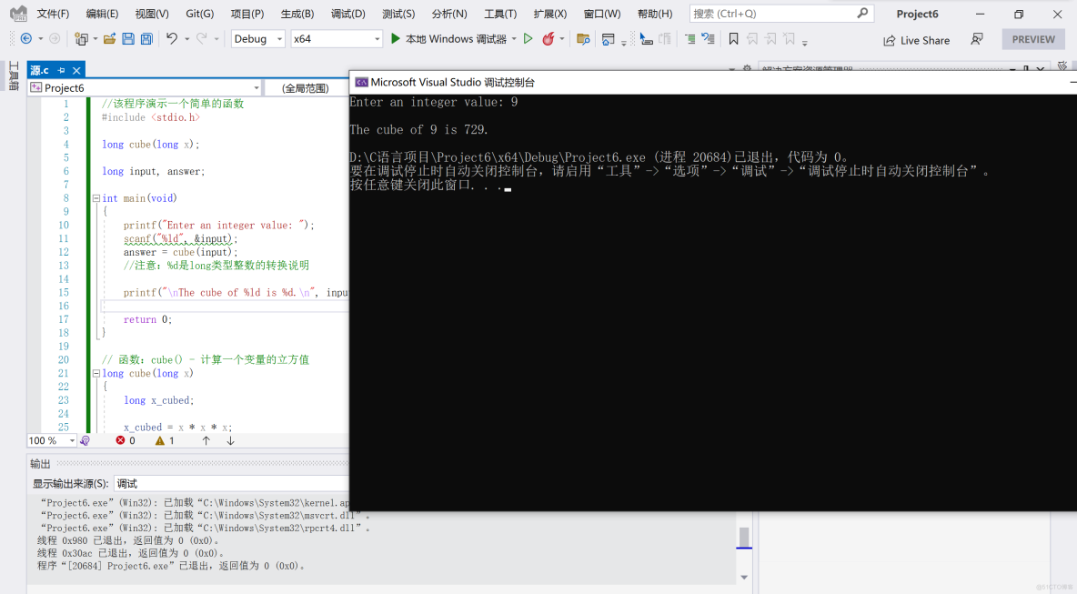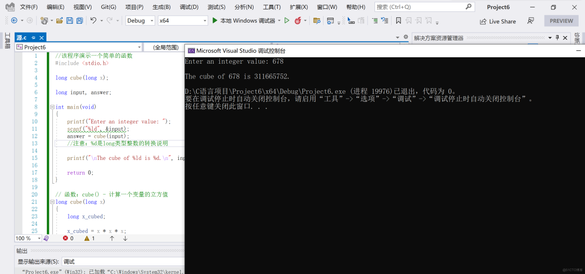 在该例中,被调用的函数是cube,其函数定义在第21~27行。