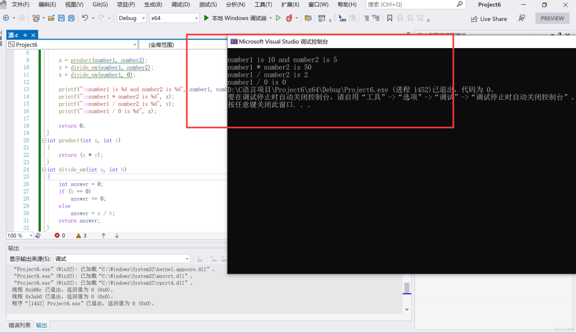 不要假设传入的值一定正确。因为0会导致程序出错,所以下面代码检查了传入的第二个值是否为0。这种方法只能防止函数低级的错误。函数将0返回主函数后结束,因为函数需要一个整型值。要真正避免除以0这种错误,应调用​​devide_em()​​函数之前在程序中检查b的值。