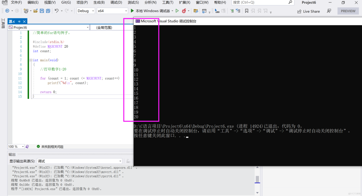该行在结束程序之前返回0。for语句频繁用于“向上计数”,将计数器变量的值递增1成为另一个值,