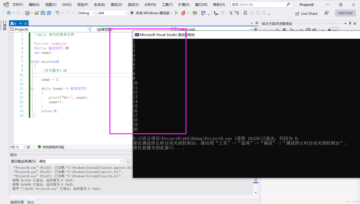 因为count被赋值为1 (count小于20 ),所以执行for语句中的printf()函数。