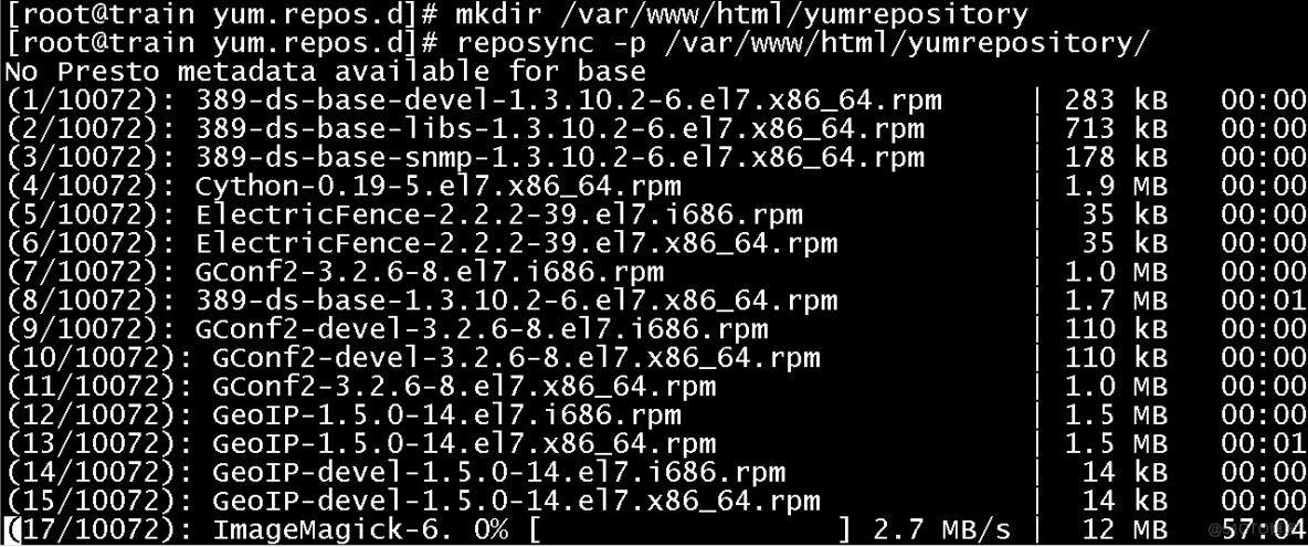 这里执行完成预计一个小时左右(根据自身网络快慢决定)所以接下来先配置yum虚拟主机: