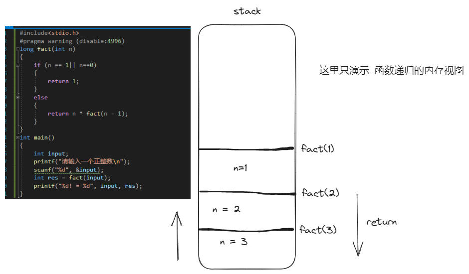 上图是函数递归的整个过程,下面再用内存的视图看一下递归函数