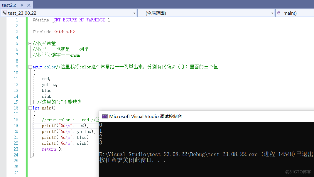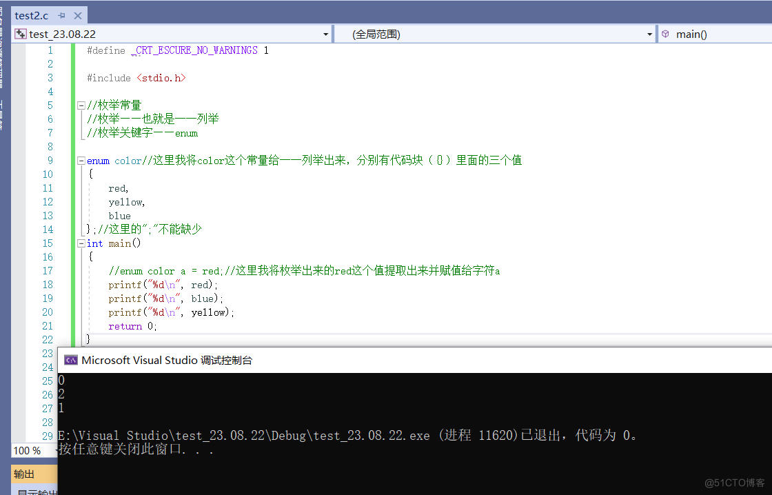 enum color//这里我将color这个常量给一一列举出来,分别有代码块({})里面的三个值