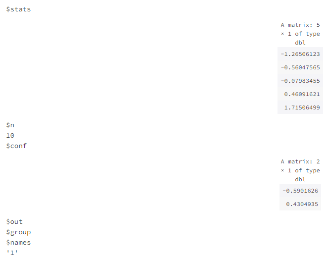 这里列表 bp 包含了多个对象,如果想查看或使用某一个对象,只需用“”符号引用。例如,要查看列表 bp 中的对象 stats 的内容,可以输入 bpstats 。对列表中其他对象感兴趣,请移步 boxplot.stats 的说明文档。