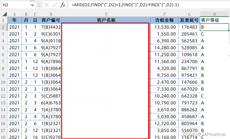 这个C列的客户代码是一大串字符,其中括号里面的字母,是客户等级,我们想它提取出来,放在H里,用公式怎么写呢?