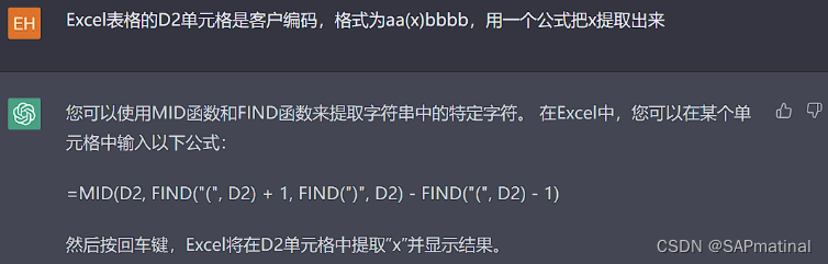 MID(D2,FIND("(",D2)+1,FIND(")",D2)-FIND("(",D2)-1)注意啊,我提问的时候并没有说a、x、b是不确定长度的字符串,但在这里ChatGPT并没有用最简单的公式=MID(D2,3,1)来解决问题,而是准确的用FIND函数根据括号来定位x的位置,这个公式虽然长点,但是兼容性更高,真的要点赞。