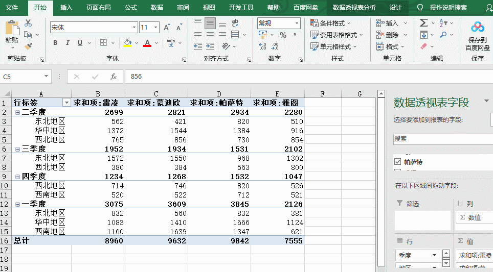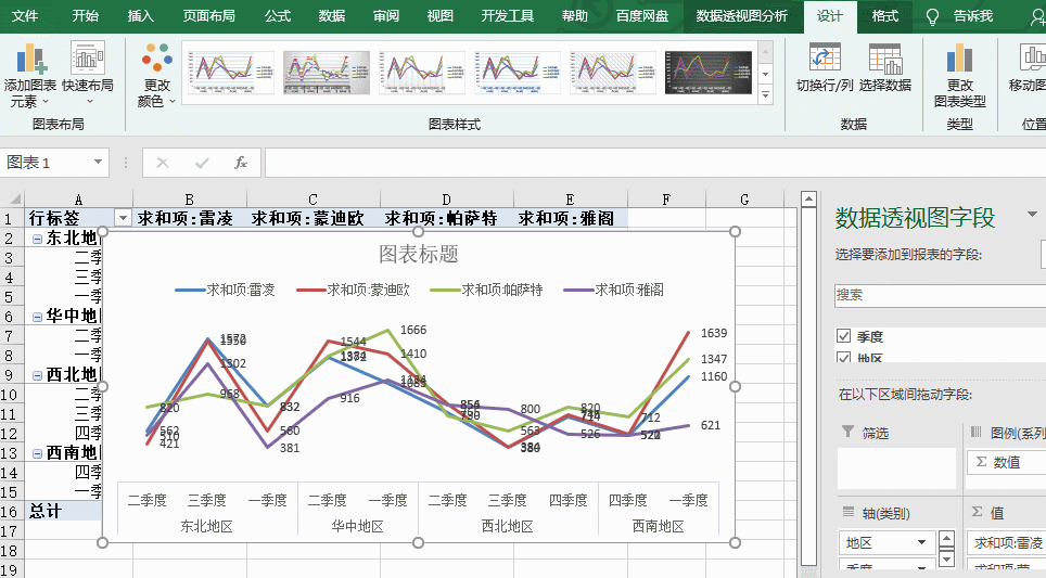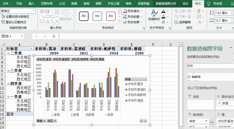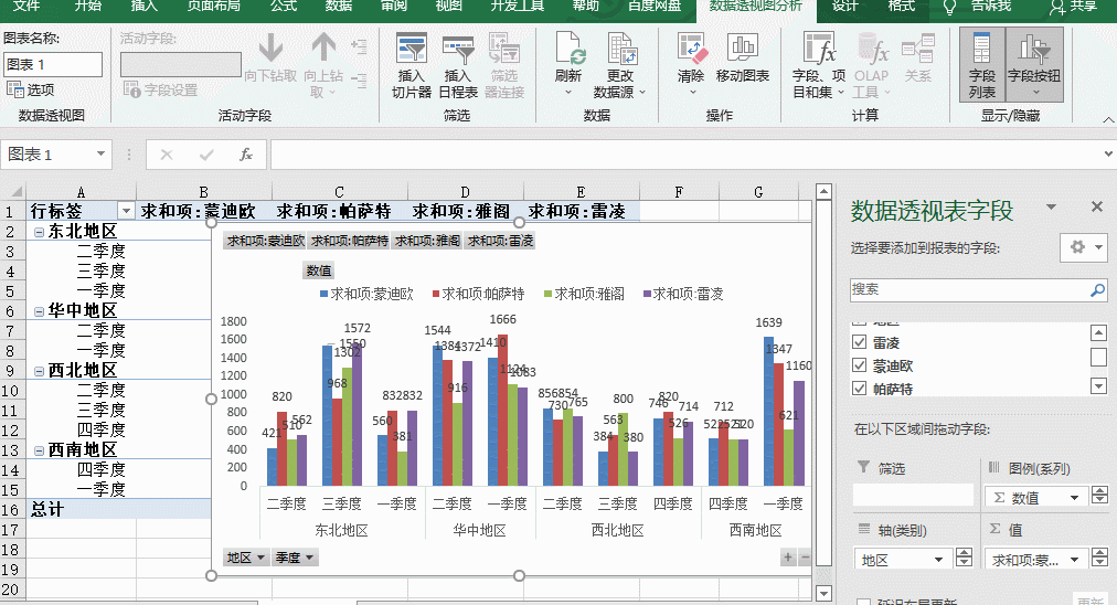 例如,可以通过使用数据透视图的筛选按钮为产品表中的数据进行分析,我想看到一季度雷凌车在各个地区的销量,具体步骤为:单击图表中的“季度”字段按钮,只勾选“一季度”,单击“确定”按钮,在数据透视表字段中,只勾选“雷凌”,这样就能到一季度雷凌车在各个地区的销量,很明显第一季度雷凌车在西南地区的销量最高,为1160辆车。