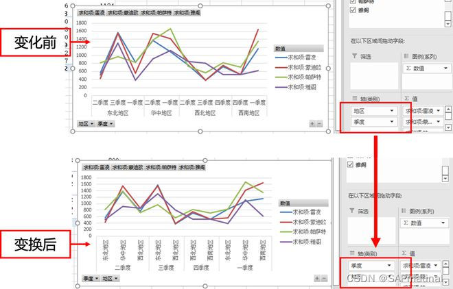 数据透视图的数据源是与其绑定的数据透视表,并不能随意更改,但可以通过将不同的字段放置在不同的区域,来改变数据透视图的显示。例如在“轴字段”列表框中调整了“季度”、“地区”两个选项的顺序,即可得到完全不同的两种显示效果。