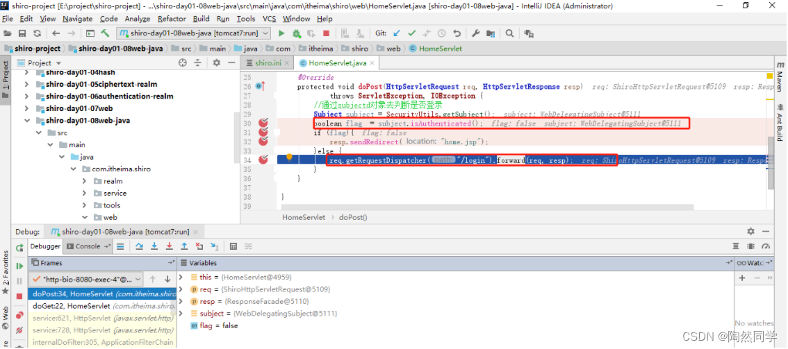 此时我们通过subject.isAuthenticated()判断是否登录,如果登录则重定向到home.jsp,如果没有登录则转发到/login对应的servlet