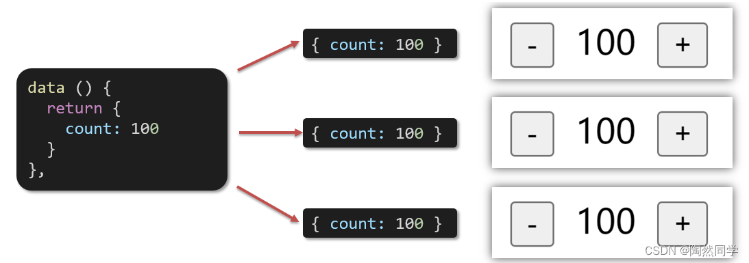 一个组件的 data 选项必须是一个函数。目的是为了:保证每个组件实例,维护独立的一份数据对象。