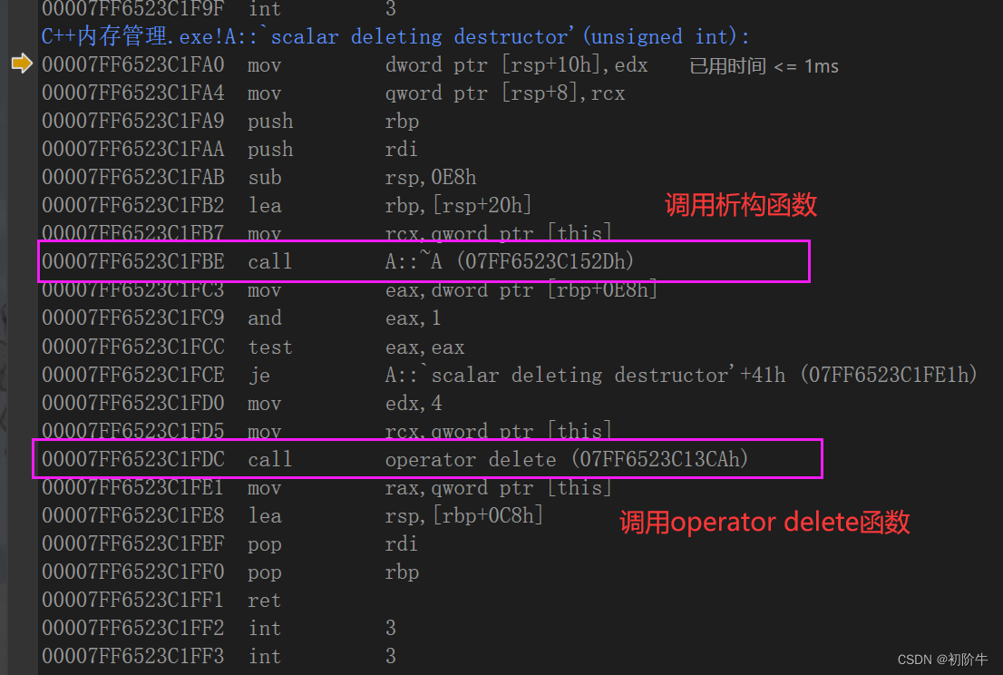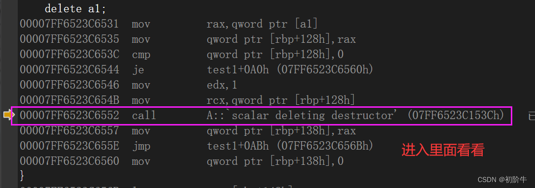 查看delete操作符,由于vs编译器进行了再封装,我们需要进到下面这条指令里面去看: