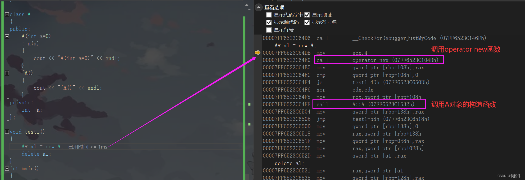 }通过调试窗口的反汇编窗口,我们查看A* a1 = new A;对应的汇编指令: