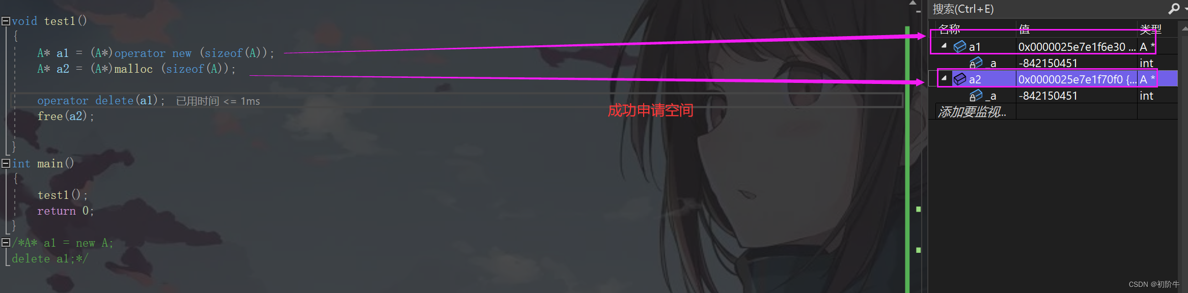 需要注意的是,连续的多个空间须使用new[]与delete[]搭配