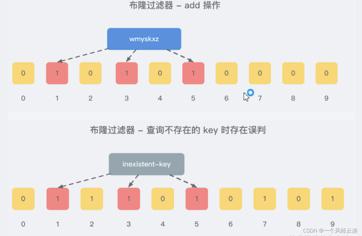查找key时 将这个key的多个位置上的值取出来,只要有其中一位是零就表示这个key不存在,但如果都是1,则不一定存在对应的key。(也就是有,不一定有,无,就一定无) 比如我们在 add 了字符串wmyskxz数据之后,很明显下面1/3/5 这几个位置的 1 是因为第一次添加的 wmyskxz 而导致的。 此时我们查询一个没添加过的不存在的字符串inexistent-key,它有可能计算后坑位也是1/3/5 ,这就是误判了