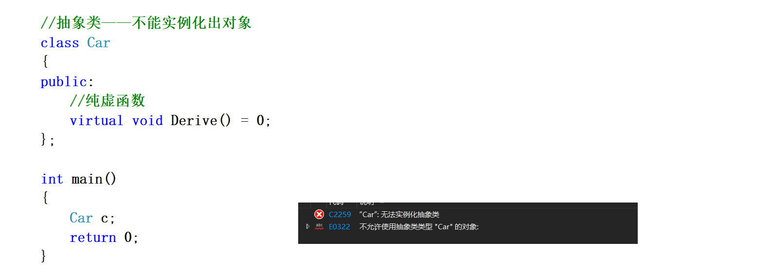 在虚函数的后面写上 =0 ,则这个函数为纯虚函数。包含纯虚函数的类叫做抽象类(也叫接口类),抽象类不能实例化出对象。派生类继承后也不能实例化出对象,只有重写纯虚函数,派生类才能实例化出对象。纯虚函数规范了派生类必须重写,另外纯虚函数更体现出了接口继承。