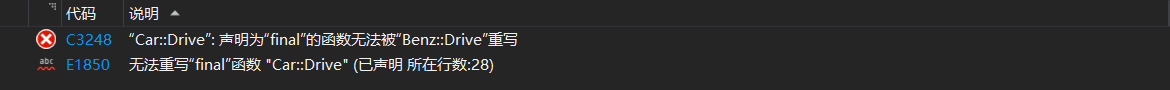 override: 检查派生类虚函数是否重写了基类某个虚函数,如果没有重写编译报错