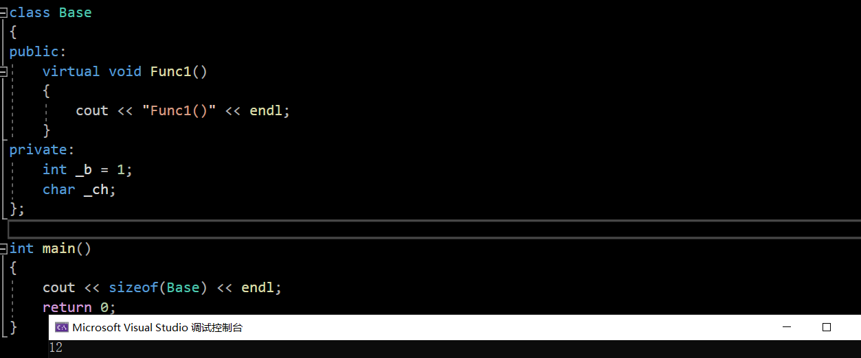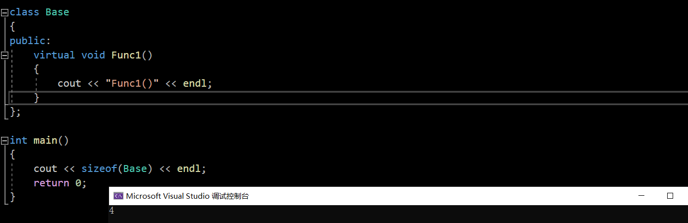 答案是根据成员然后内存对齐算出8吗?不是的,如果没有成员变量,我们可能会认为虚函数是1个字节,因为没有成员变量,根据我们前面所说的,空类进行占位,1个字节。但是结果是4个字节: