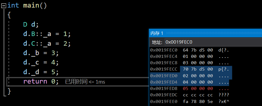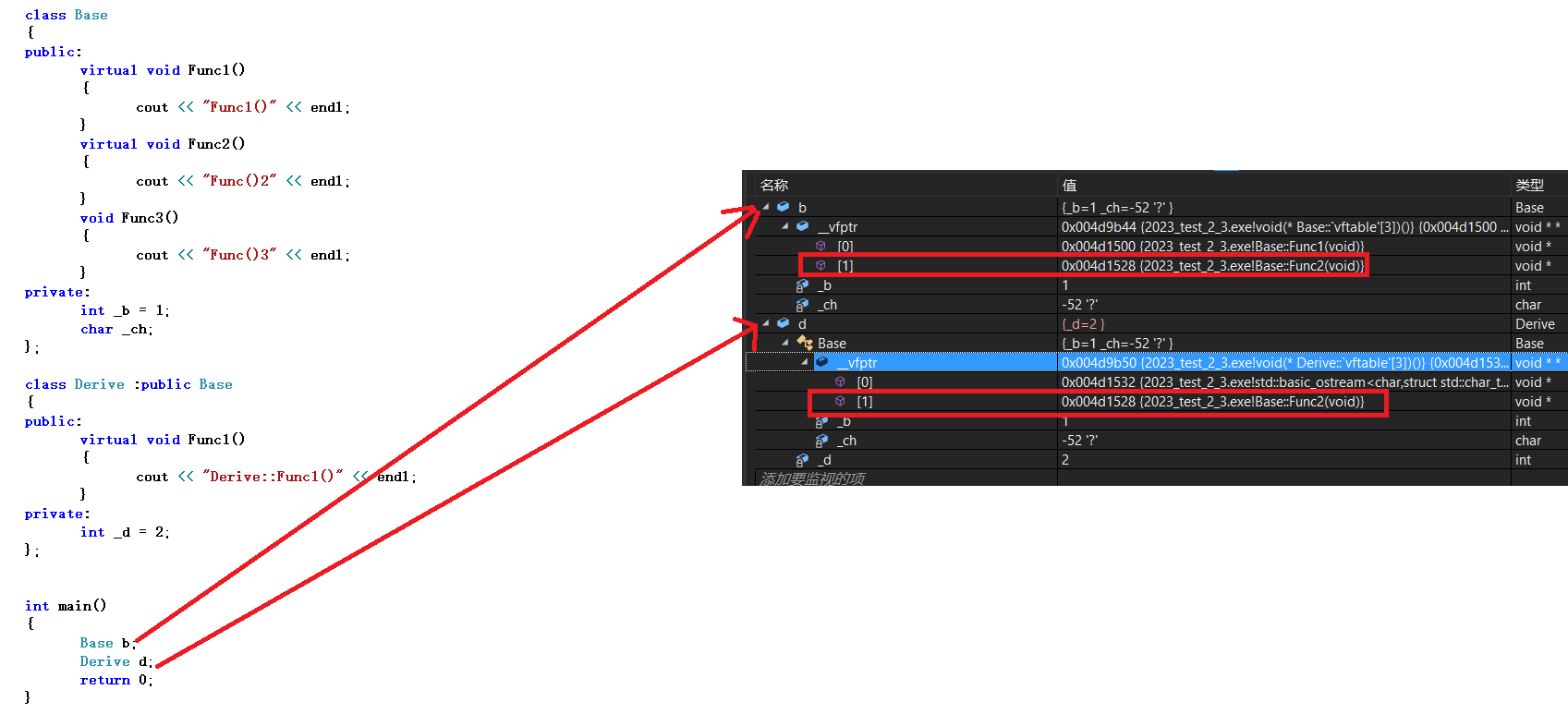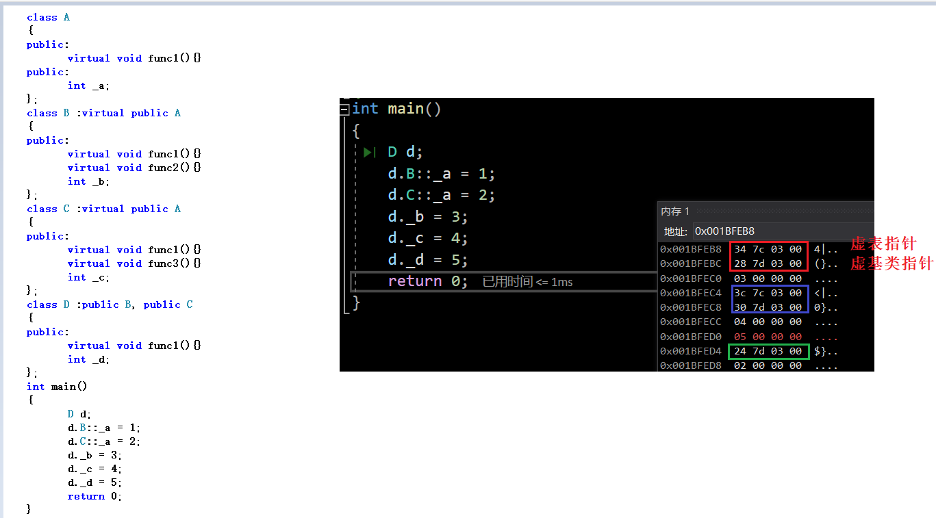 相比之前,菱形继承这个地方多了一个虚表,其他跟多继承并没有什么区别: