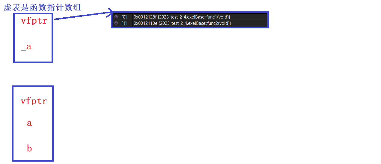 对象中的这个指针我们叫做虚函数表指针(v代表virtual,f代表function)。一个含有虚函数的类中都至少都有一个虚函数表指针,因为虚函数的地址要被放到虚函数表中,虚函数表也简称虚表。注意区分虚基本,虚基表是偏移量。