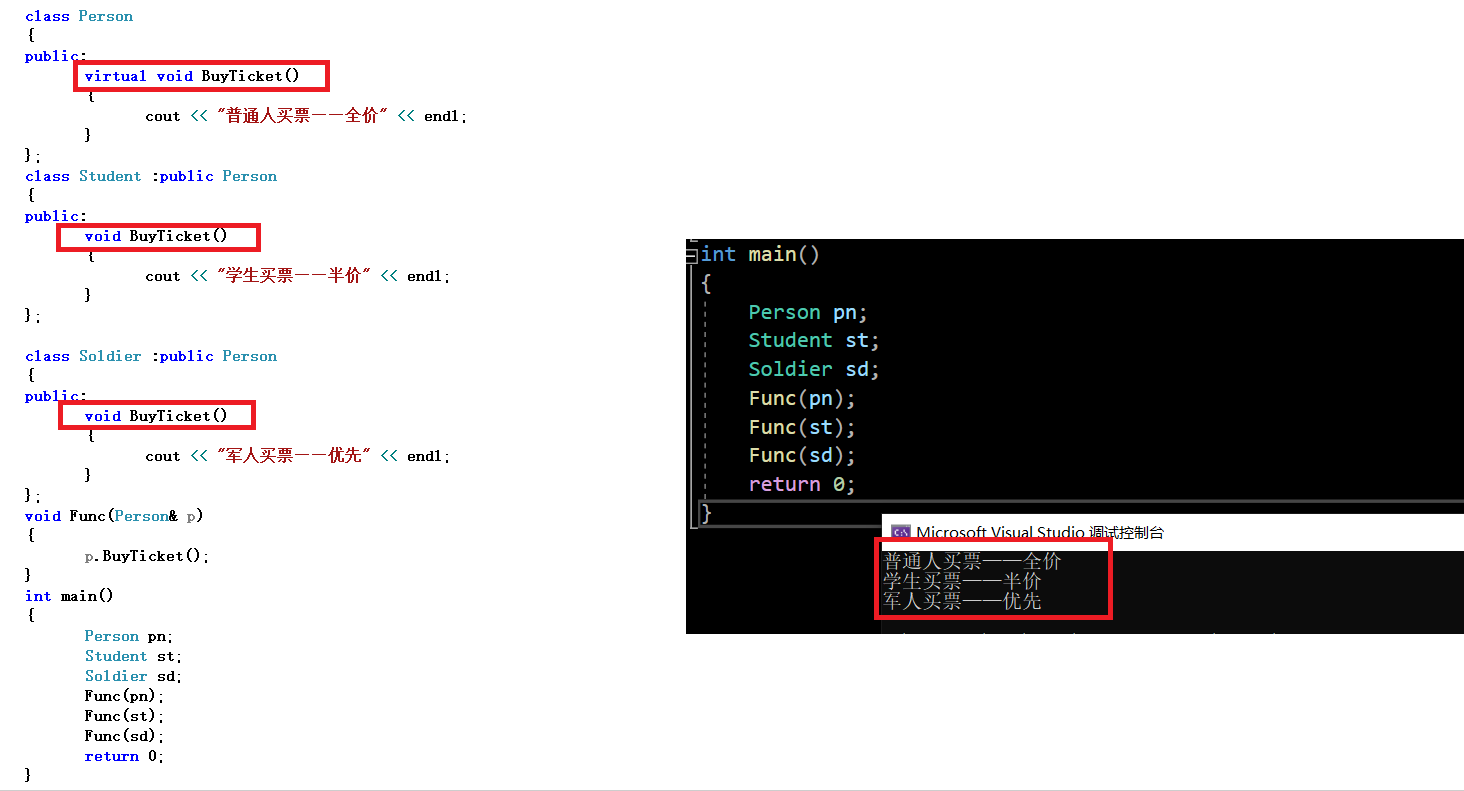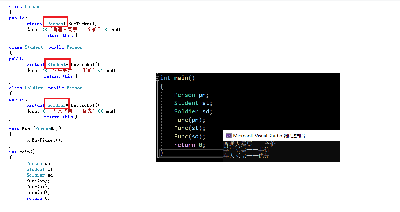 虚函数的重写(覆盖):派生类中有一个跟基类完全相同的虚函数(即派生类虚函数与基类虚函数的返回值类型、函数名字、参数列表完全相同。即三同:返回值类型、函数名、参数列表完全相同),称子类的虚函数重写了基类的虚函数。比如上面的子类的虚函数重写: