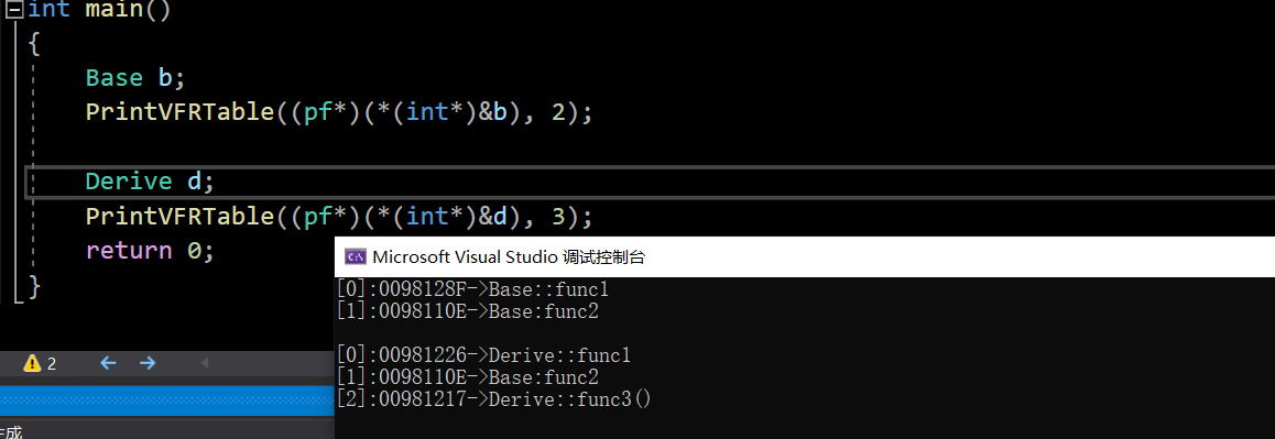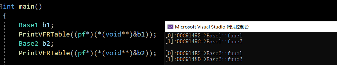 但是并没有显示func3(),这里可以理解为VS做了优化,没有显示出来。导致我们看不出来,下面我们可以使用代码打印出虚表中的函数: