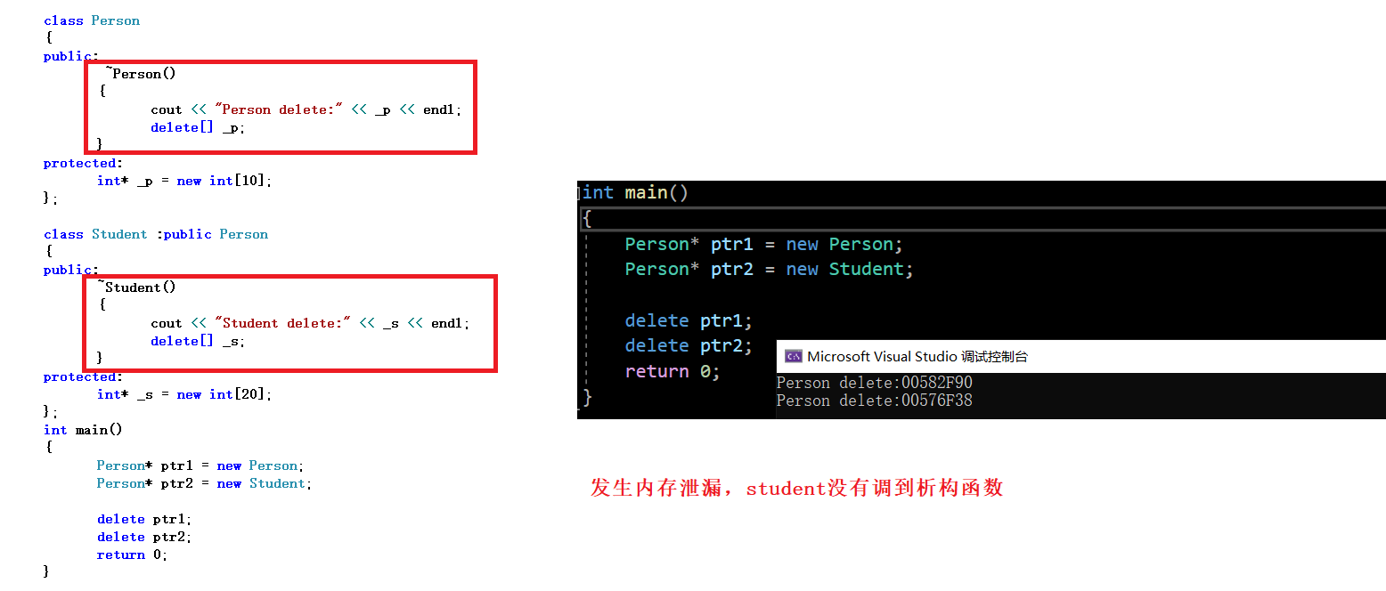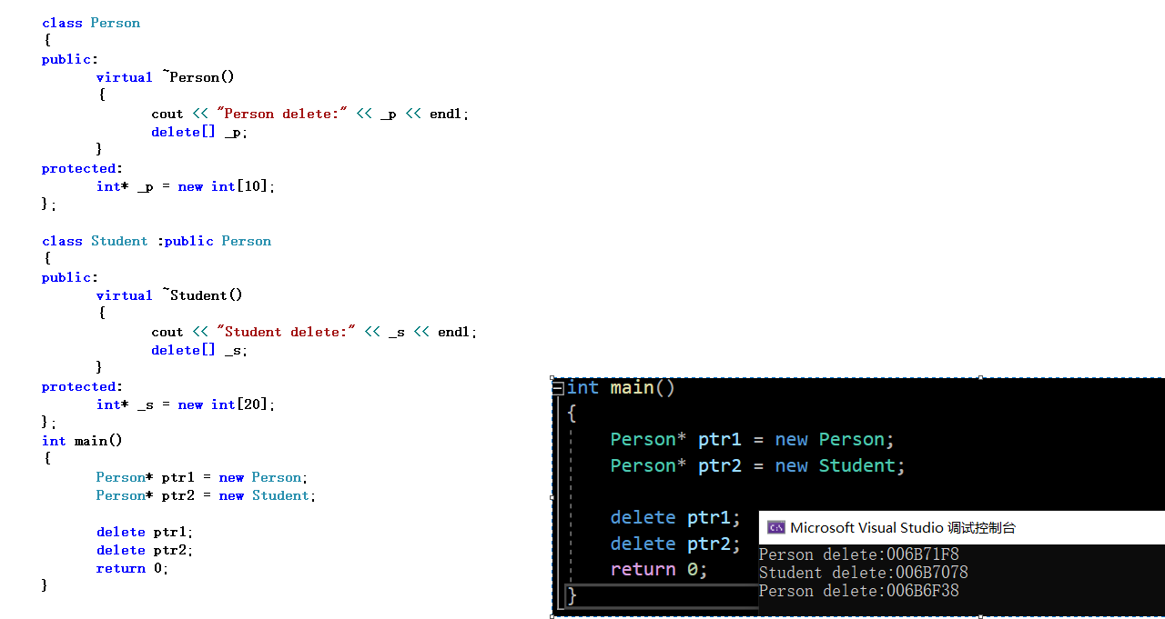 delete的行为:1.使用指针调用析构函数 2.operator delete(ptr).此时的ptr1和ptr2都是Person的类型,普通调用跟调用类型有关,是什么类型就调用什么析构函数。但是Person指针除了指向父类对象,还要指向子类对象。而上面并没有调用子类的析构函数,后果严重要造成内存泄漏。这里我们希望的是调用析构函数是一种多态调用而不是普通调用,与指针类型无关,跟指向的对象有关,所以要想多态调用,必须得是虚函数:
