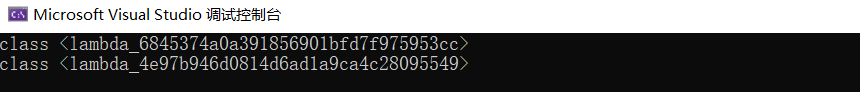 注意:lambda表达式之间不能赋值,每个lambda表达式的类型都是不同的(在VS下,lambda表达式会被处理为函数对象,该函数对象对应的类名叫做<lambda_uuid>。),这也是lambda表达式之间不能相互赋值的原因
