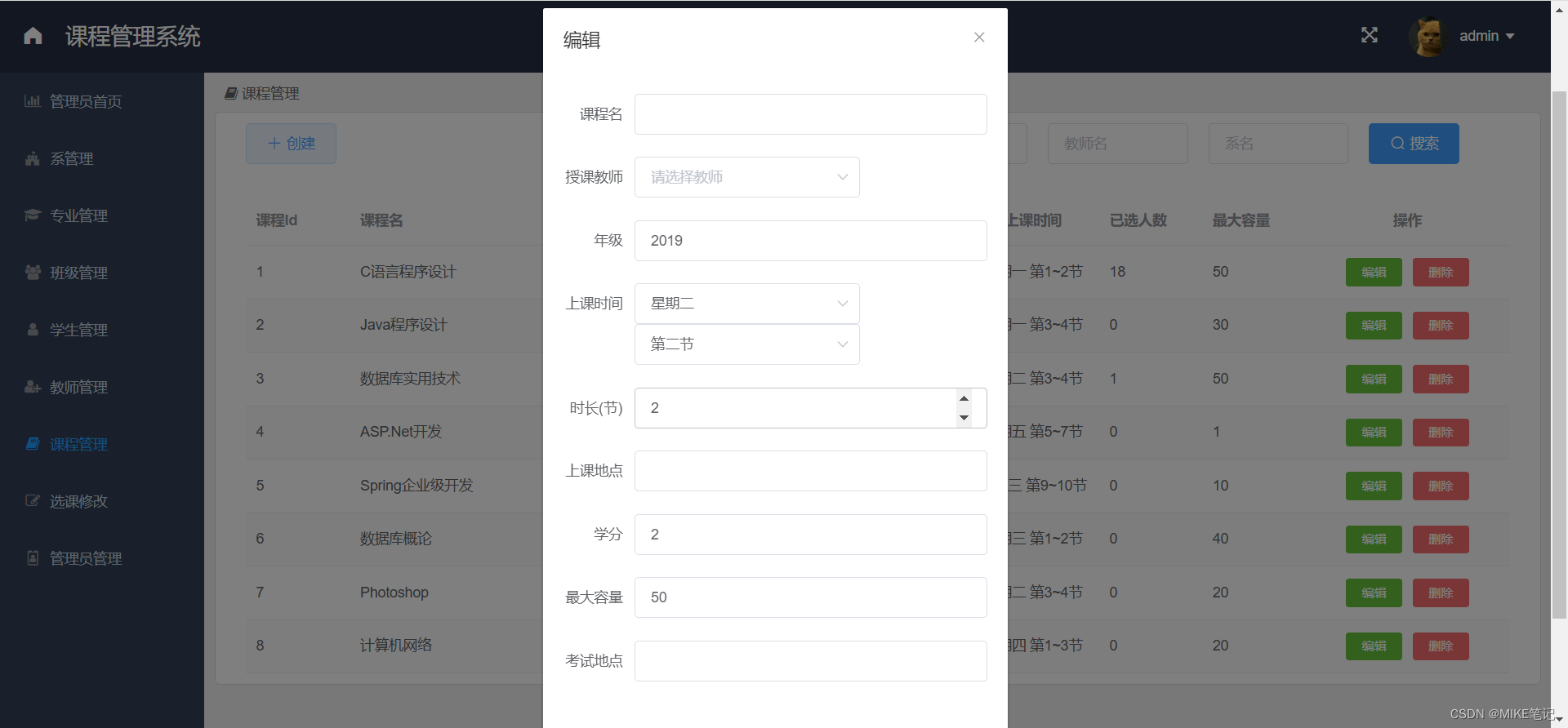 随着高校规模逐渐扩大,学生数量增多,人为课程管理任务繁重,工作繁多。课程管理系统成为学生以及老师和学校必备的系统,主要完成教师发布课程、上传成绩,学生选课、查看成绩以及生成课表的全过程。 因高校人数过多,手动操作各项数据和管理极易出错,为了提高办公效率,节省人力,加快高校信息化发展速度,需要开发课程管理系统,已达到协同高效办公的目的。 系统演示:基于Springboot+vue的学生课程管理系统的设计与实现-哔哩哔哩