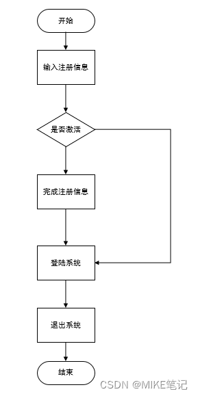 用户通过页面注册进行注册,系统发送验证码到注册的邮箱里,将用户的信息存入到数据库里,点击链接完成激活,查询数据库中是否有该用户。最后在页面输入用户名和密码登陆,在系统中完成操作之后,退出系统