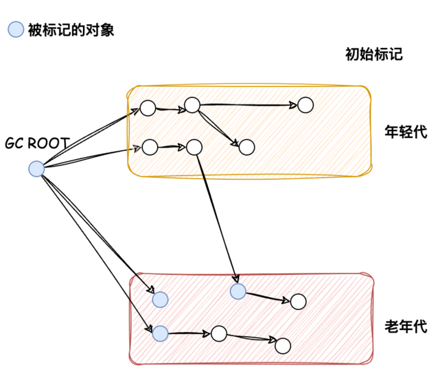 这一步仍然需要暂停所有的其他线程,但这个阶段会很快完成。它的目的是「标记所有的根对象,以及被根对象直接引用的对象,以及年轻代指向老年代的对象」。