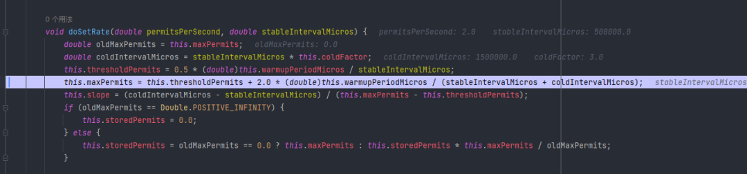 SmoothWarmingUp 是另一种实现,它包含了一个预热期,在此期间令牌会以较慢的速度生成。预热之后,令牌生成将达到正常速度。这种方式可以防止系统在初始阶段就被大流量冲垮,允许系统有一定的缓冲期来适应高流量。使用 RateLimiter.create(double permitsPerSecond, long warmupPeriod, TimeUnit unit) 时创建,warmupPeriod 就是热身达到稳定速度的时间。SmoothWarmingUp最大令牌数的计算方法则要复杂的多: