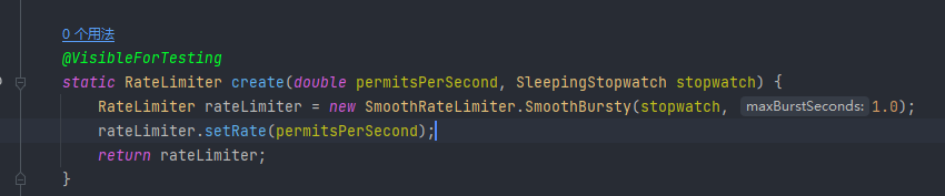 SmoothBursty 是一种基本的实现,当令牌桶中足够的令牌时,允许突发的请求。如果令牌被完全消耗掉,则每个新的请求都需要等待新的令牌生成。这种方式适合应对突然的大流量,但在令牌消耗殆尽后,响应时间可能会增加。使用 RateLimiter.create(double permitsPerSecond) 创建。通过Debug我们可以看到,SmoothBursty方法的最大令牌数被设置成了,maxBurstSeconds 乘以 permitsPerSecond,而maxBurstSeconds默认是1。