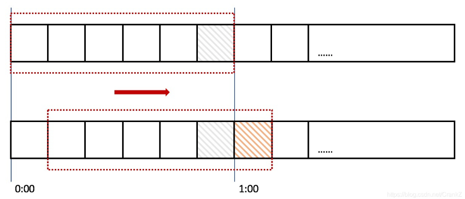 图中,整个红色的矩形框表示一个时间窗口,在我们的例子中,一个时间窗口就是一分钟。然后我们将时间窗口进行划分。比如图中,我们就将滑动窗口划成了6格,所以每格代表的是10秒钟。每过10秒钟,我们的时间窗口就会往右滑动一格。
