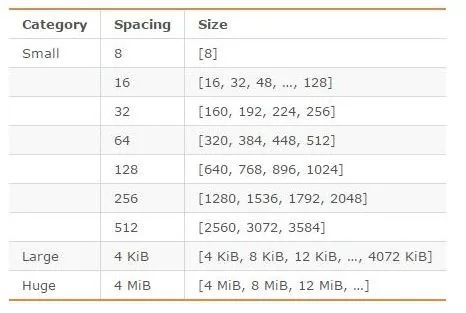 jemalloc在64位系统中,将内存空间划分为小、大、巨大三个范围。每个范围内又划分了许多小的内存块单位,存储数据的时候,会选择大小最合适的内存块进行存储。