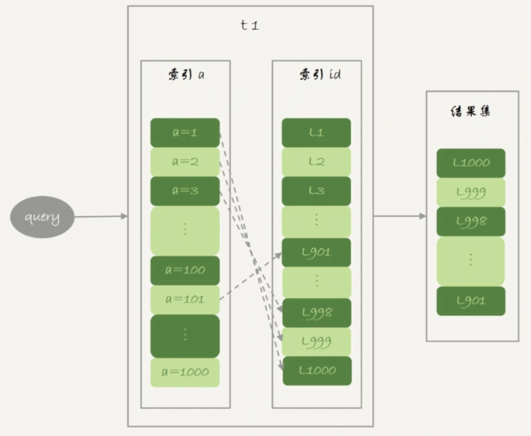 如果随着a的值递增顺序查询的话,id的值就变成随机的,那么就会出现随机访问,性能相对较差。虽然“按行查”这个机制不能改,但是调整查询的顺序,还是能够加速的。