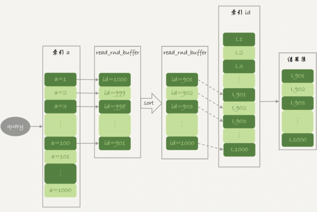 然后,MySQL会根据这些行位置,按照物理存储的顺序(通常也就是主键顺序)去获取行数据。这样就能避免大量的随机I/O,因为数据现在是按照它们在磁盘上的物理存储顺序被访问的。