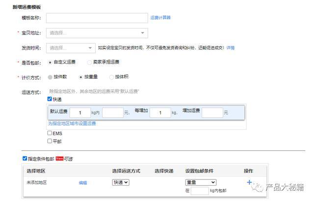 注意:无免邮条件情况下,此时首费标准、包邮重量取值为 0。