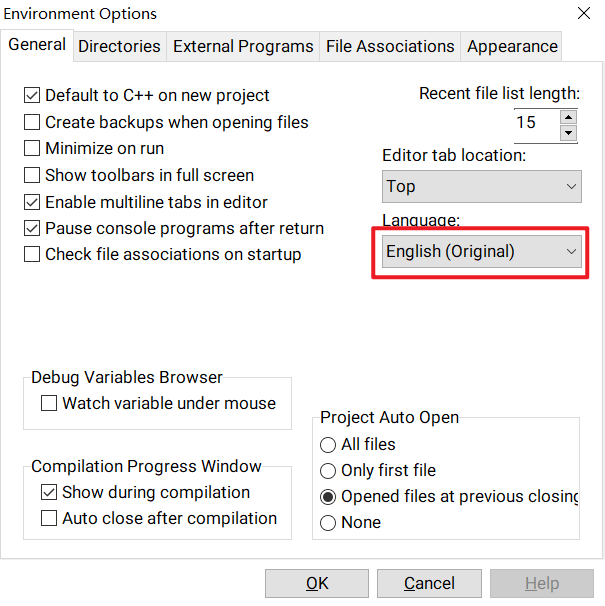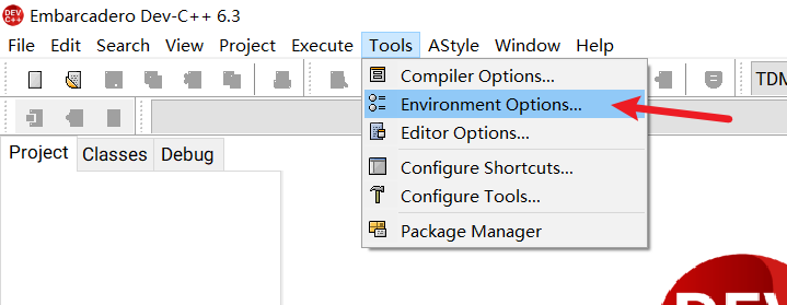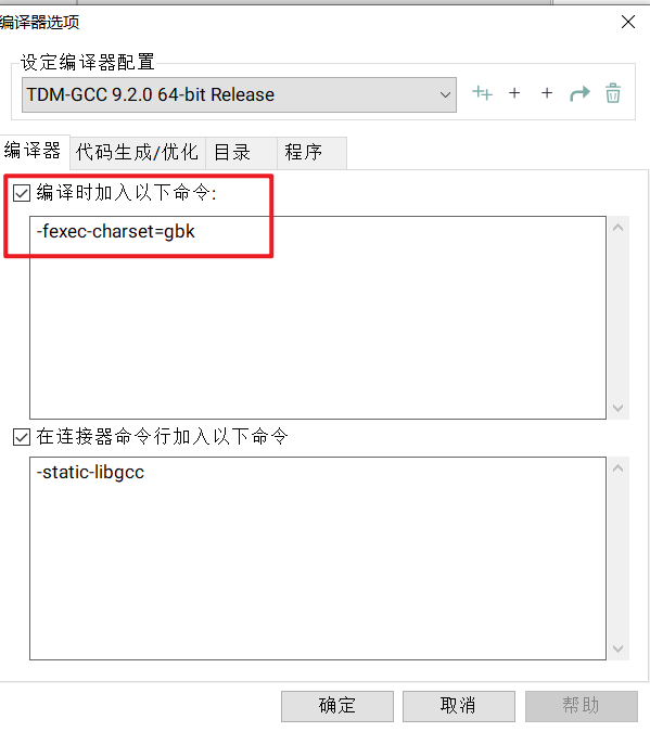 点击工具(Tools)-> 编译器选项(Compiler Options)勾选图示标红选项并向下面的文本框中添加参数 “-fexec-charset=gbk”,然后点击确定(OK)