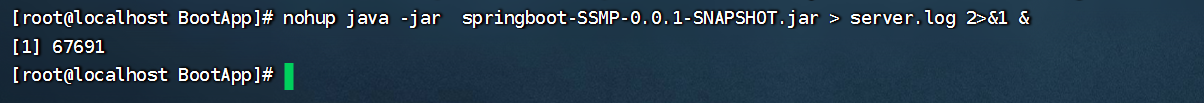 后台启动Boot工程:> server.log:将日志输入到此文件中2>&1:将标准错误输出重定向到标准输出nohup java -jar springboot-SSMP-0.0.1-SNAPSHOT.jar > server.log 2>&1 &命令运行得到的是程序的pid