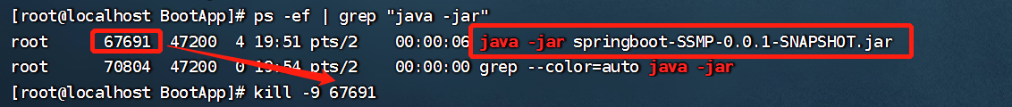 关闭后台启动的Boot工程ps -ef | grep "java -jar" #查找工程启动命令的pid