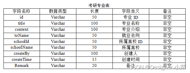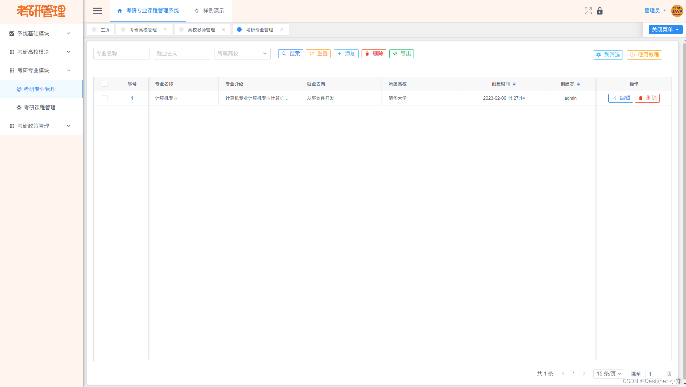 考研专业模块是为了管理各大高校开设的考研专业,有了考研高校后后,学生可以查询每个高校的考研专业,其中考研专业的字段包括专业名称、专业介绍、就业去向、所属高校ID、所属高校、创建人、创建时间、备注等,管理员可以增加、删除、编辑和条件查询考研专业,学生可以查询指定高校开设的考研专业。