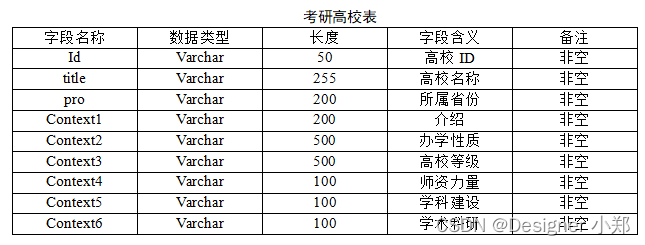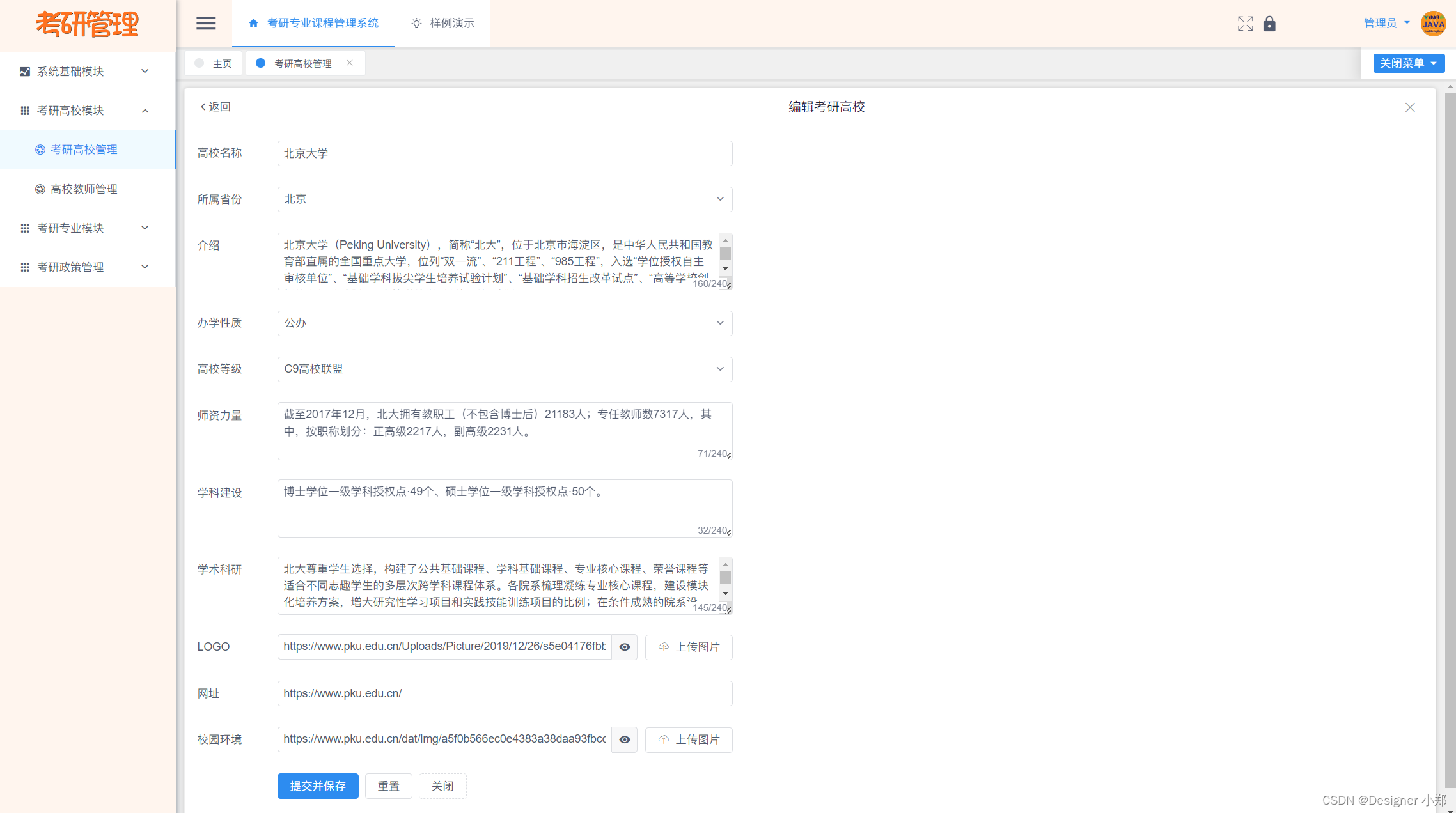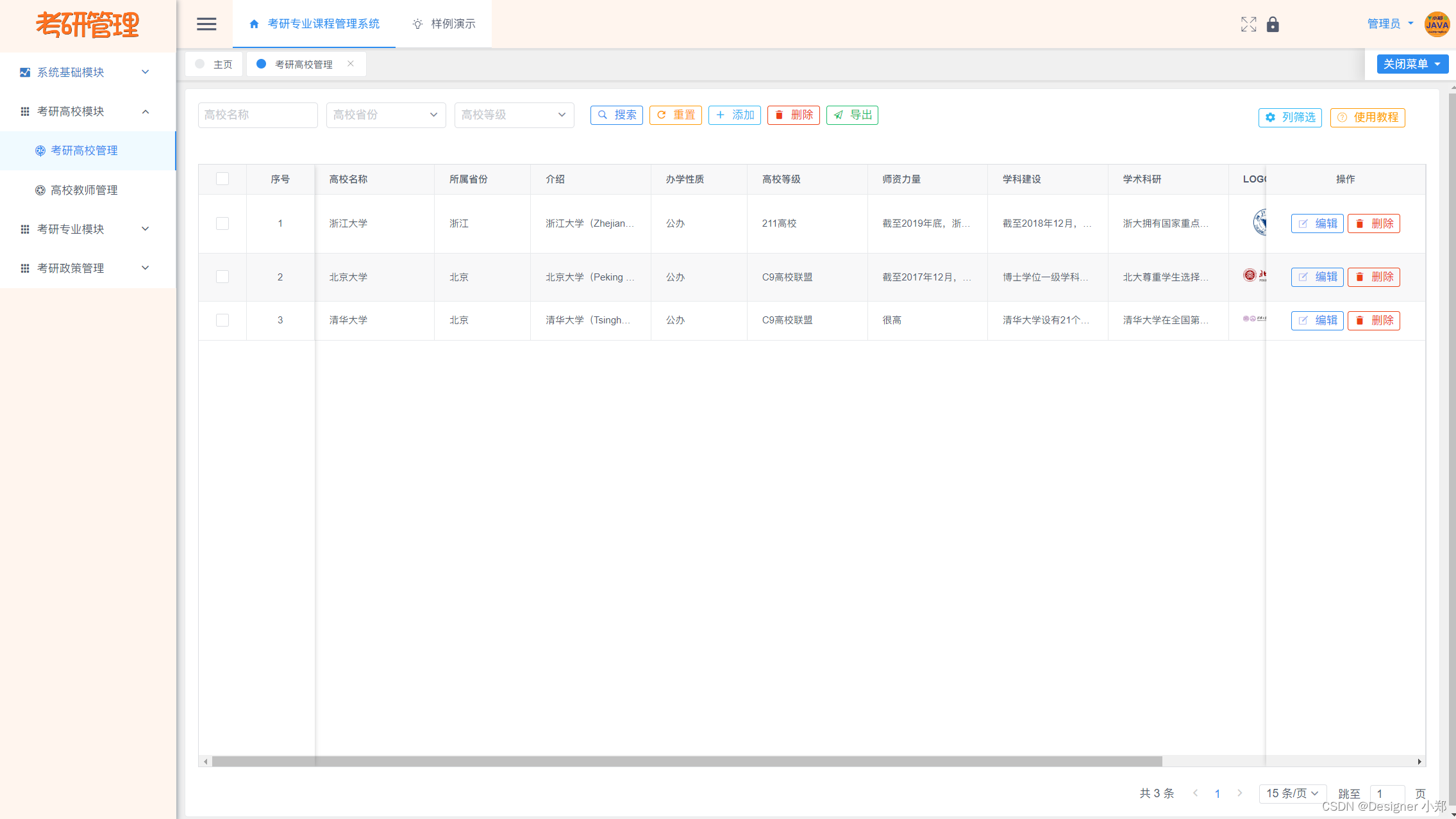 考研高校模块用于对考研高校的数据进行管理,其中包括高校名称、所属省份、介绍、办学性质、高校等级、师资力量、学科建设、学术科研等,可以通过此模块对考研高校数据进行添加、编辑更新、删除、查询操作。