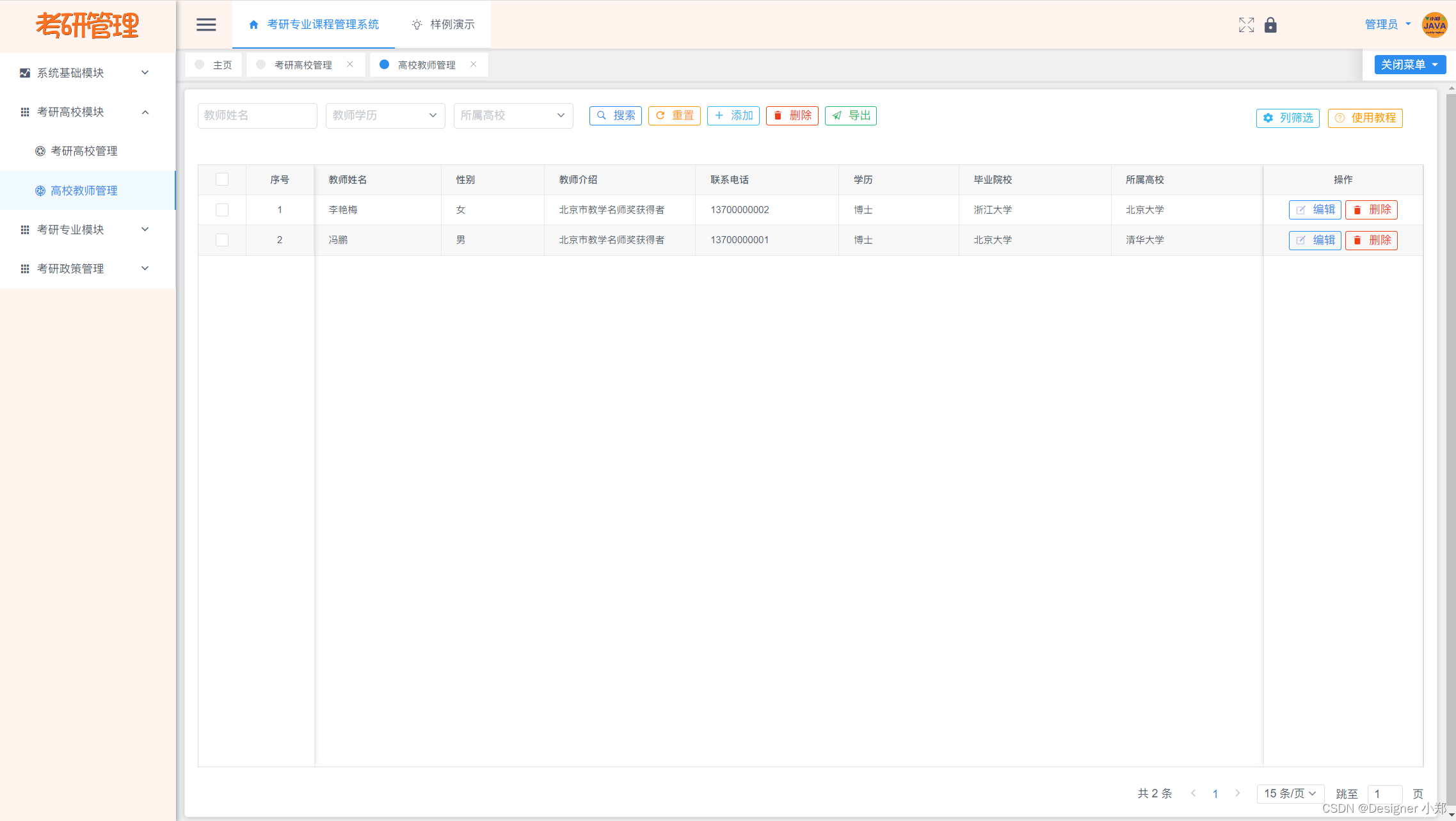 高校教师管理模块是对高校的教师信息进行管理,高校教师是高校教学的参与者,高校教师字段包括教师姓名、性别、教师介绍、联系电话、学历、毕业院校、所属高校、备注等,管理员可以新增高校教师的数据,学生可以查询管理员发布的高校教师信息。