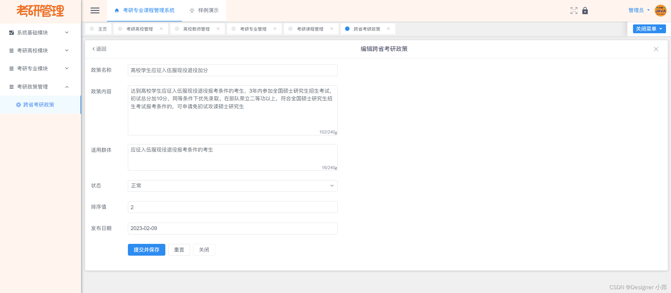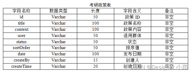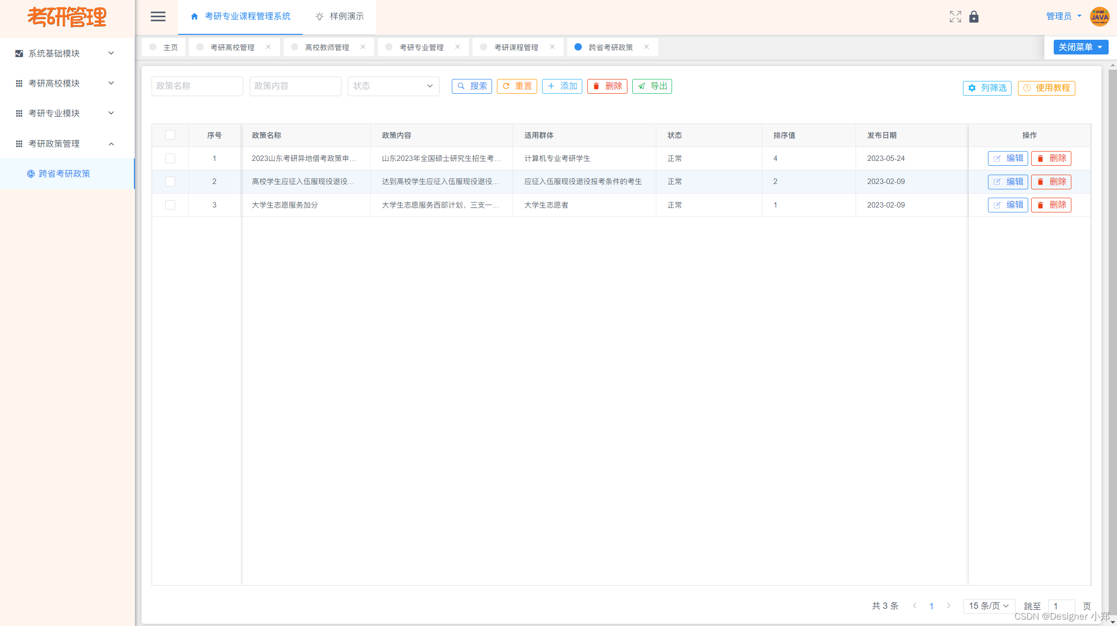 考研政策模块是维护关于考研的相关政策,如奖学金补助、考研政策图解等。考研政策模块是为了帮助考研学生备考,避免错过各类优待政策,其中考研政策包括政策名称、政策内容、适用群体、状态、排序值、发布日期、创建人、创建时间等,管理员可以增加、删除、编辑和条件查询考研政策内容,学生可以按需查询适配的考研政策。