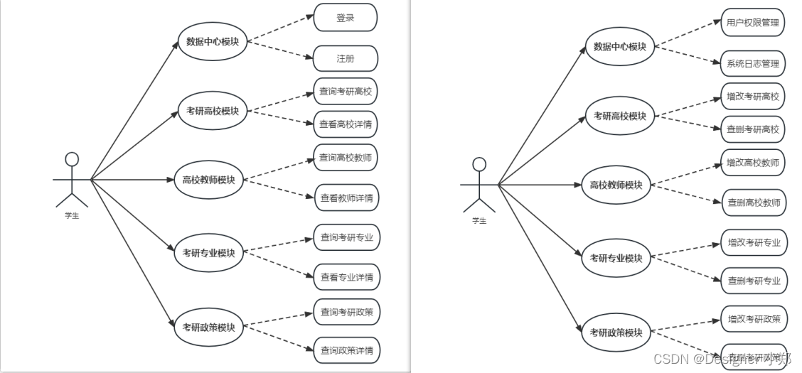 UML是面向对象的图形化建模语言,具有表示容易,定义友好,适用范畴广泛,功能强大。用例图是用例模型的一种,需求分析人员可采用用例图表示用户操作行为。考研专业课程管理系统的用例图设计主要包括学生用户用例图设计、考研管理员用例设计。
