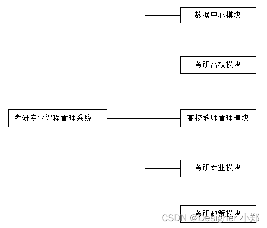 本文设计的考研专业课程管理系统的包括了系统数据中心模块,用来存放管理系统通用的模块,另外分别设计了考研高校模块、高校教师管理模块、考研专业模块、考研政策模块这四大模块,用于存放系统的核心业务逻辑。