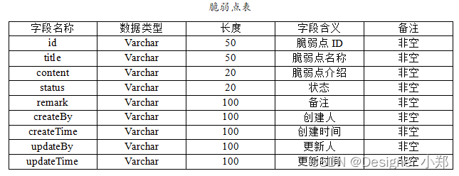 木马不是凭空产生的,当软件有了脆弱点之后,木马才能乘虚而入,所以需要对软件的脆弱点进行管理。脆弱点字段包括脆弱点名称、脆弱点介绍、状态、备注、创建人、创建时间、更新人、更新时间,管理员可以新增、删除、编辑和条件查询脆弱点数据,用户可以查询管理员发布的脆弱点数据。